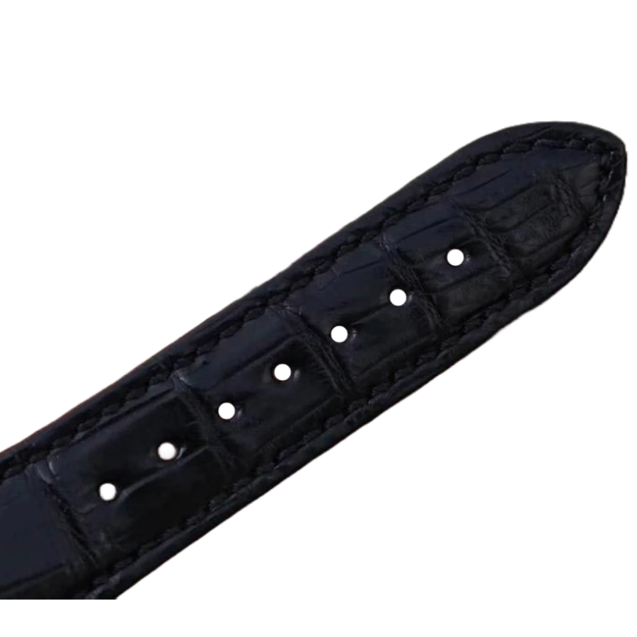 The black leather strap, secured with a fold clasp in a diamond-finish tone, provides a balanced contrast to the bright dial and ensures a comfortable fit with adjustable links just like the genuine model.