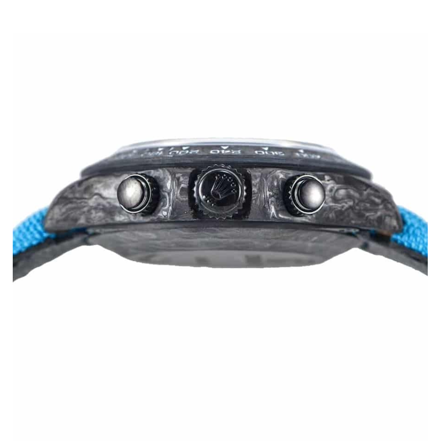 Crafted with a 904L stainless steel case featuring a forged carbon color, this 40.00 mm timepiece boasts robustness and a commanding presence on the wrist. The sapphire crystal ensures that the dial remains scratch-free and clear, giving the watch an everlasting pristine look. The fabric bracelet, adjustable to fit any wrist comfortably, is secured with a 904L stainless steel pin buckle clasp, harmoniously blending blue and black hues, adding an athletic yet sophisticated elegance.